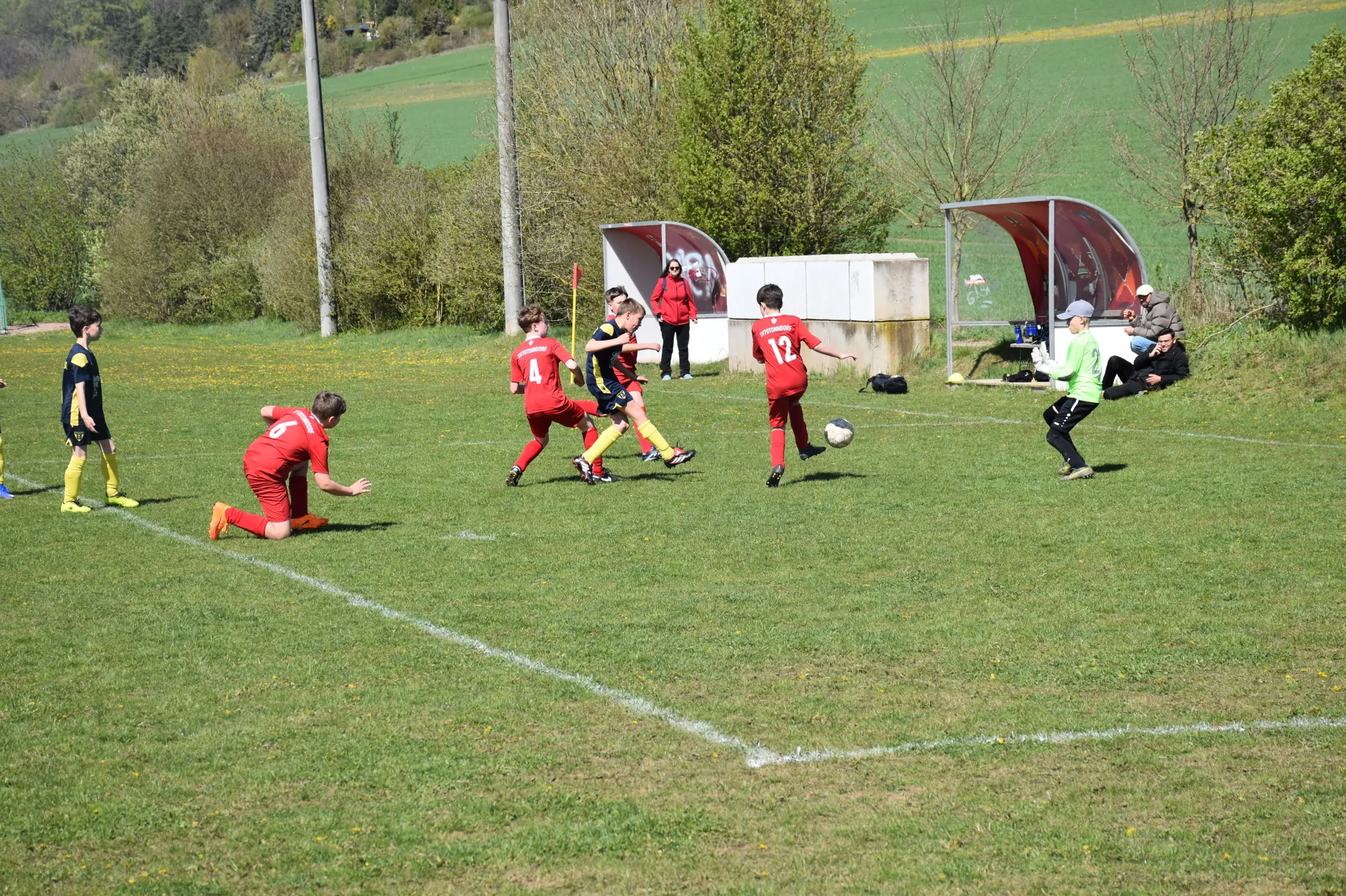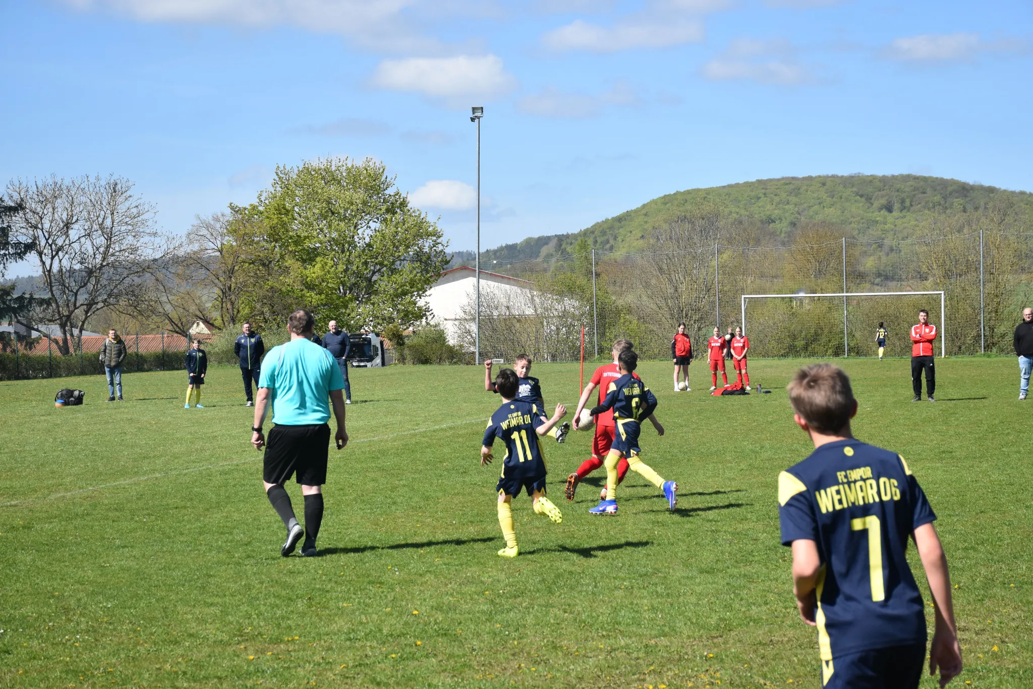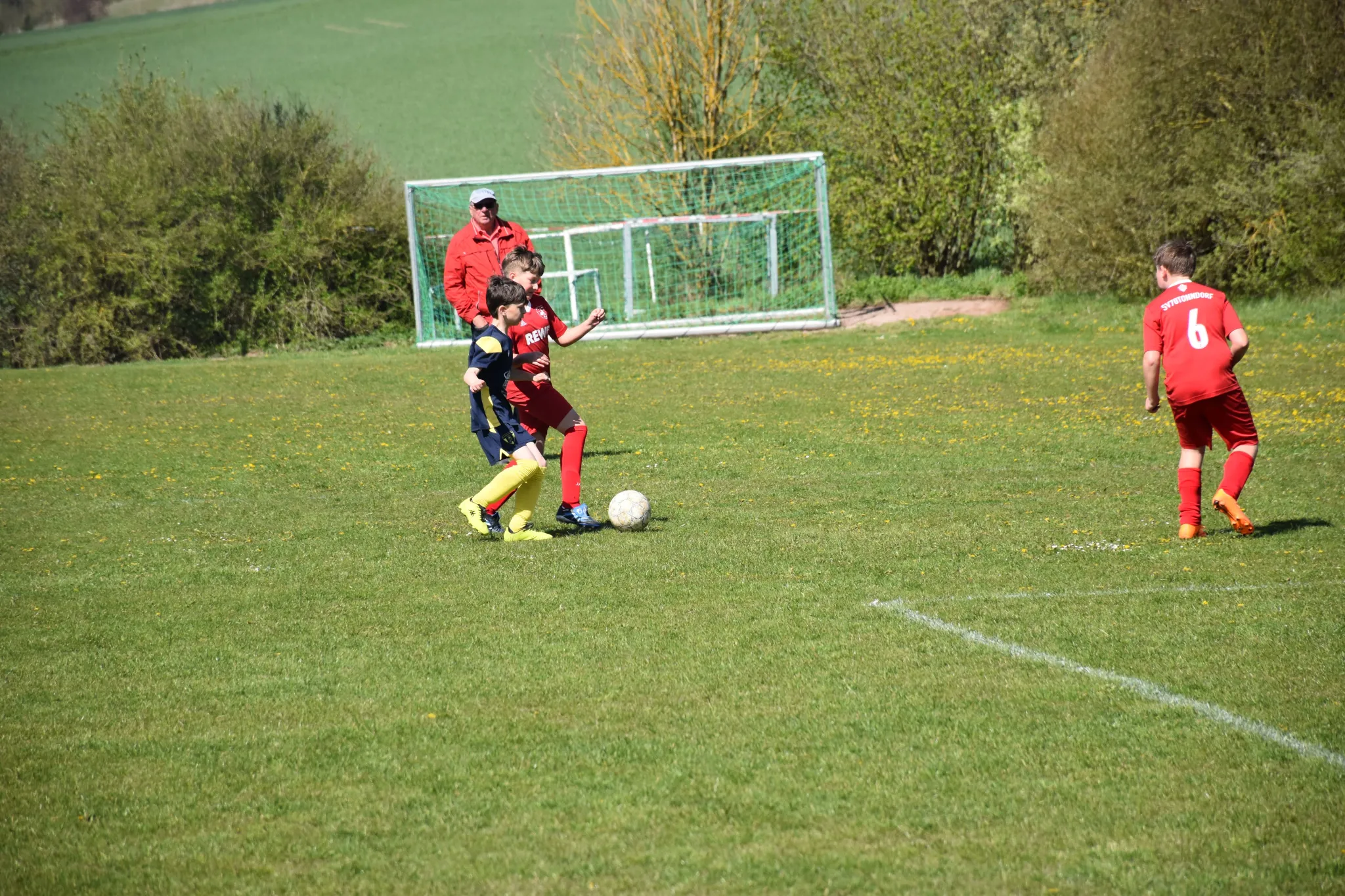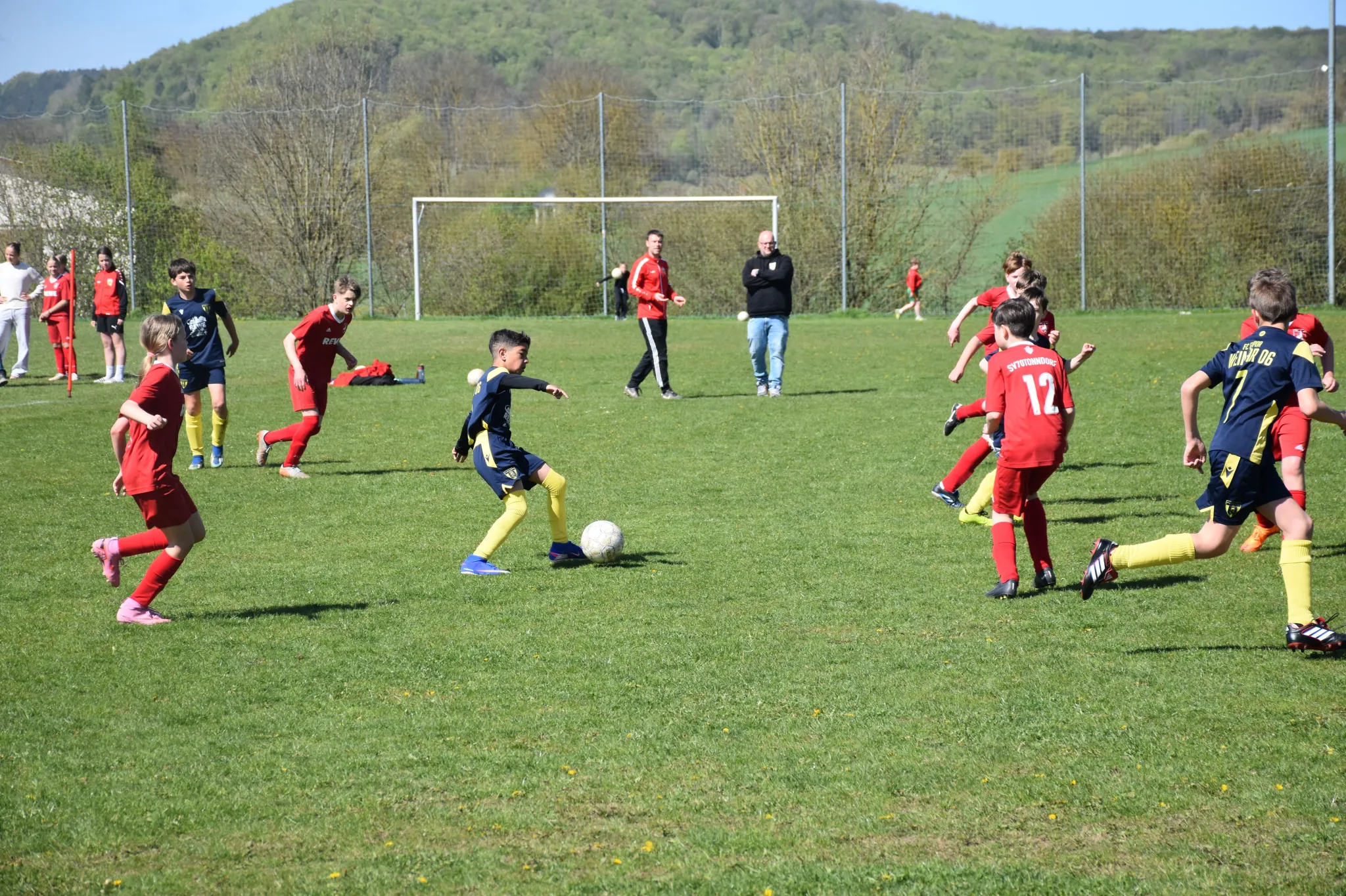 Mit spielerischen Kombinationen starteten wir ganz gut in die Partie und näherten uns dem gegnerischen Gehäuse nach und nach immer mehr an, aber im Abschluss waren wir noch zu unkonzentriert oder unglücklich. Die Sportfreunde aus Tonndorf erwischte uns, wie aus dem Nichts, mit dem ersten Schuss aufs Tor eiskalt (ein Distanzknaller lies Jasper keine Abwehrchance) und so mussten wir mit 1:0 nach 7 Minuten einen Rückstand hinnehmen. In der Folge entwickelte sich ein offener Schlagabtausch mit guten Chancen für unsere Kids (Sean tritt nur den Pfosten, der Gästekeeper parierte mehrmals die Versuchen von Nio, Layth und Luka usw.), aber der letzte entscheidende Zentimeter fehlte einfach. Eine Eckballsituation musste her, um das 1:1 durch Layth (Vorlage Luka) zu markieren. Das Spiel war wieder ausgeglichen und weiter mit mehr Spielanteilen auf unserer Seite. Dann die große Chance zum 1:2, aber aus einem Meter konnten wir den Ball einfach nicht im gegnerischen Tor unterbringen und was dann folgte, war ein klassischer Konter bei dem unserem Keeper dann erneut keine Chance gelassen wurde und das 2:1 für die Gastgeber bedeutete. Noch vor der Pause mussten wir dann noch das 3:1 mit ansehen.