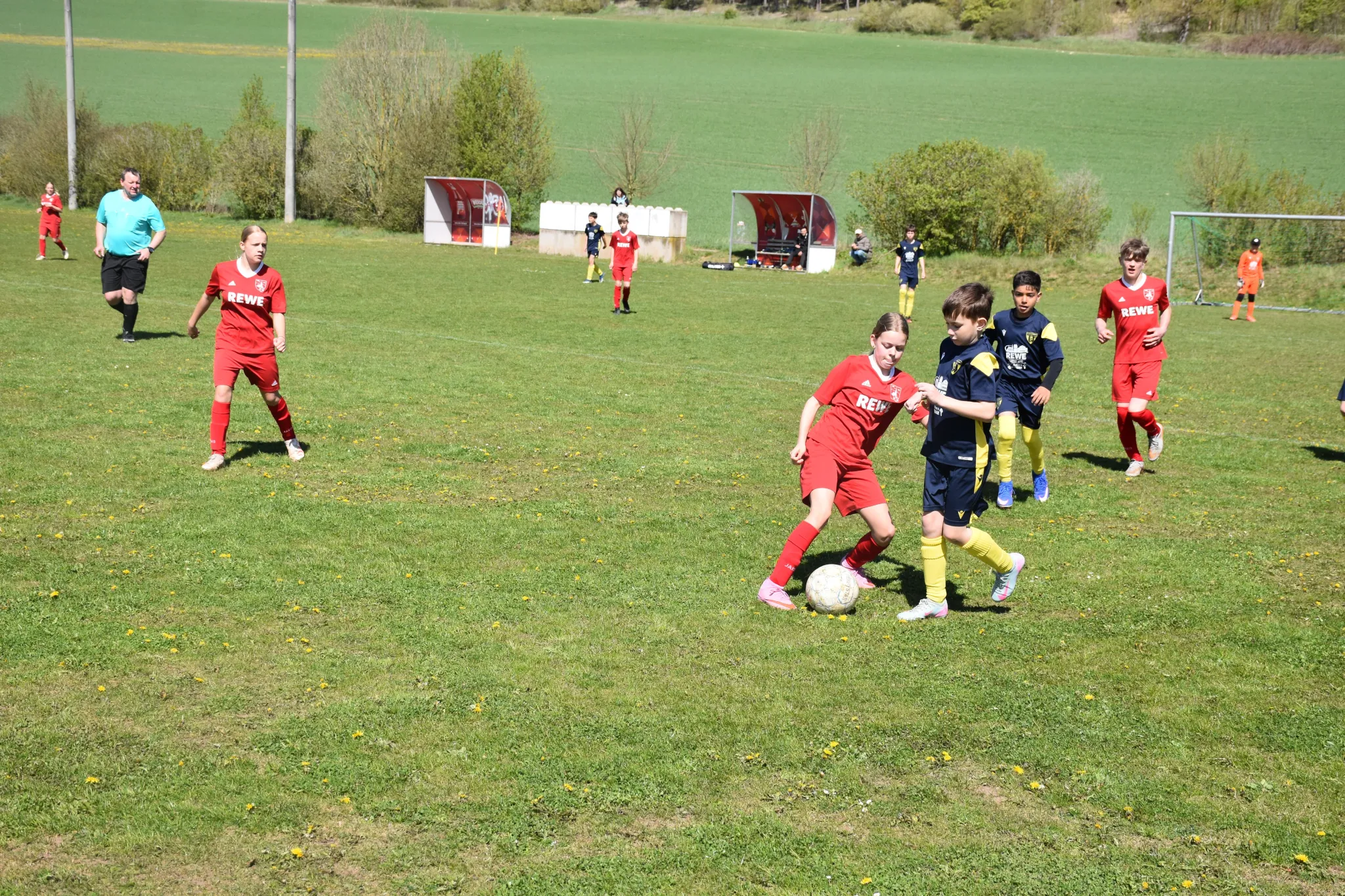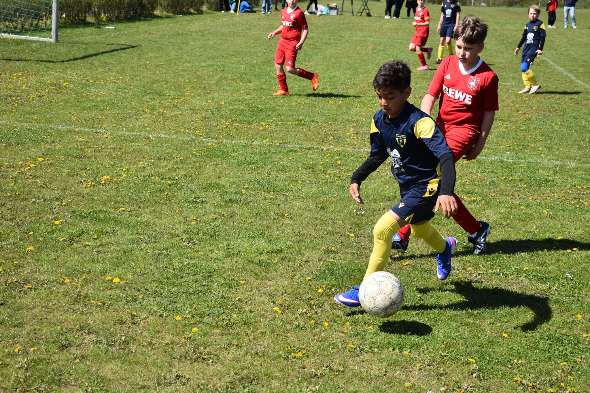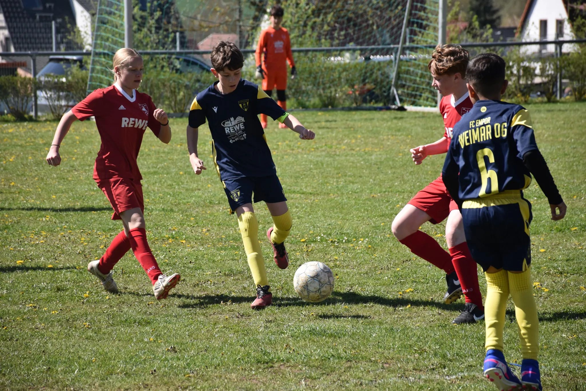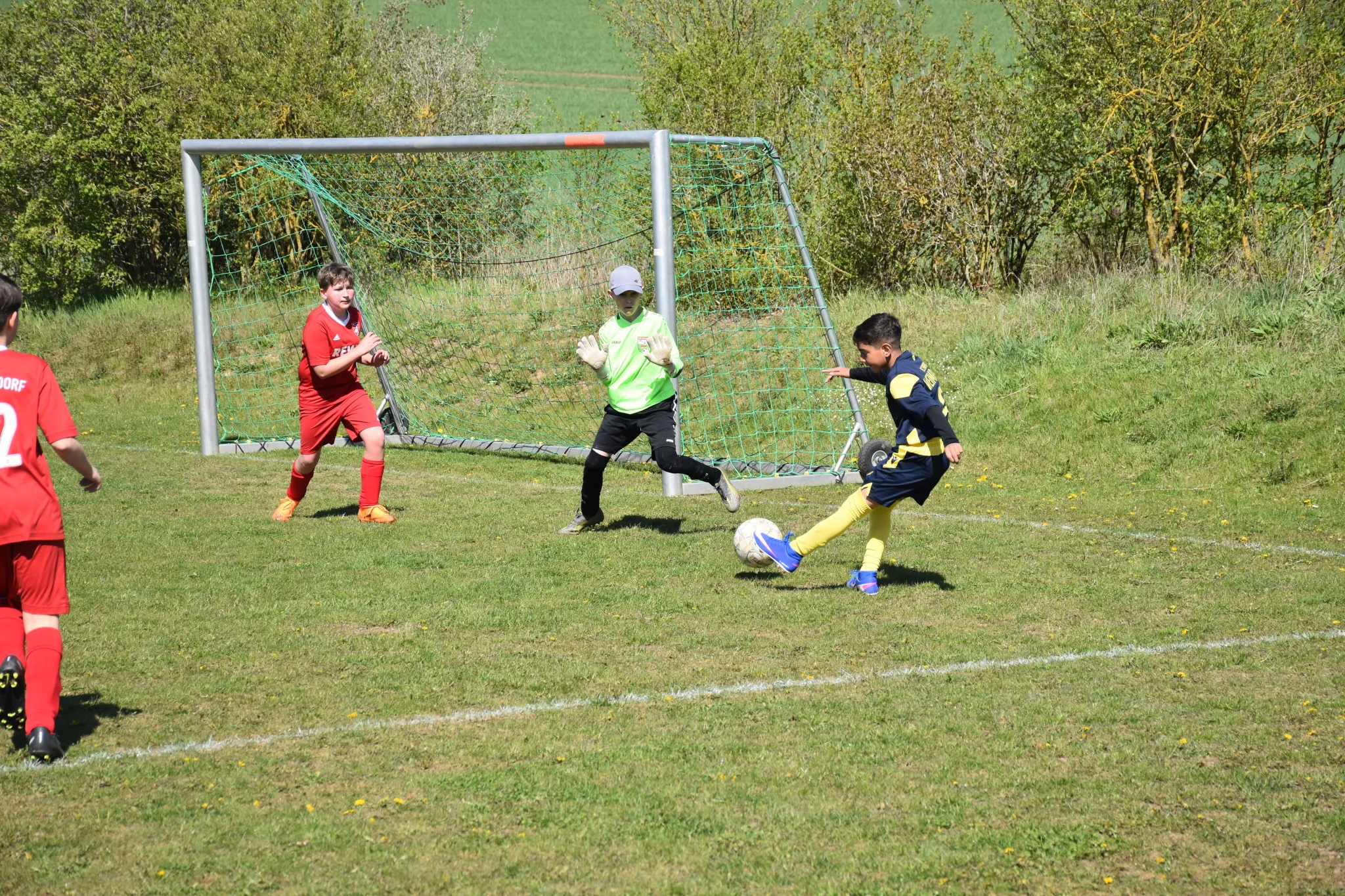 Mit spielerischen Kombinationen starteten wir ganz gut in die Partie und näherten uns dem gegnerischen Gehäuse nach und nach immer mehr an, aber im Abschluss waren wir noch zu unkonzentriert oder unglücklich. Die Sportfreunde aus Tonndorf erwischte uns, wie aus dem Nichts, mit dem ersten Schuss aufs Tor eiskalt (ein Distanzknaller lies Jasper keine Abwehrchance) und so mussten wir mit 1:0 nach 7 Minuten einen Rückstand hinnehmen. In der Folge entwickelte sich ein offener Schlagabtausch mit guten Chancen für unsere Kids (Sean tritt nur den Pfosten, der Gästekeeper parierte mehrmals die Versuchen von Nio, Layth und Luka usw.), aber der letzte entscheidende Zentimeter fehlte einfach. Eine Eckballsituation musste her, um das 1:1 durch Layth (Vorlage Luka) zu markieren. Das Spiel war wieder ausgeglichen und weiter mit mehr Spielanteilen auf unserer Seite. Dann die große Chance zum 1:2, aber aus einem Meter konnten wir den Ball einfach nicht im gegnerischen Tor unterbringen und was dann folgte, war ein klassischer Konter bei dem unserem Keeper dann erneut keine Chance gelassen wurde und das 2:1 für die Gastgeber bedeutete. Noch vor der Pause mussten wir dann noch das 3:1 mit ansehen.