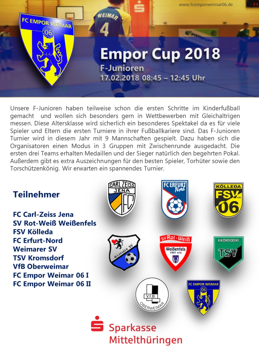 Heute möchten wir das F-Junioren Turnier des Empor-Cup 2018 vorstellen. Die F-Junioren werden den Empor-Cup 2018 am Samstag Vormittag eröffnen. Wir freuen uns besonders auf den FCC aus Jena. Mit den Rot-Weißen aus Weißenfels haben wir auch eine Mannschaft aus Sachsen-Anhalt dabei.