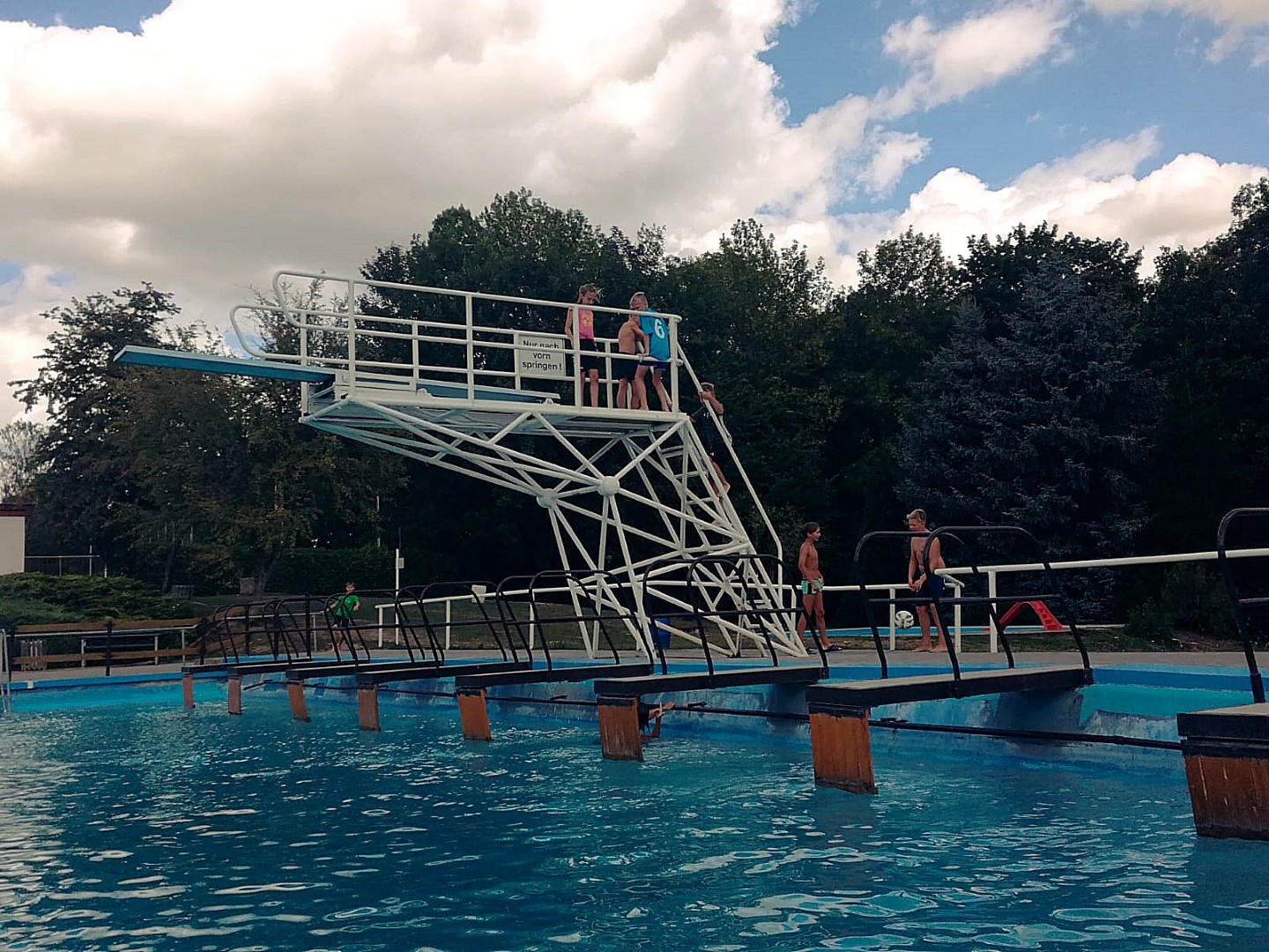 Im Bad angekommen gab es zunächst für jeden ein liebevoll angagiertes Lunchpaket bevor es auf den Sprungturm, an die Tischtennisplatten oder den Volleyballplatz ging. Hier konnten alle sich abkühlen und zunächst etwas entspannen. Der Rückweg wurde dann etwas schwieriger da uns die geballte Ladung Wind aus Weimar entgegenbließ. Trotzdem meisterten alle im Team mit Windschattenfahrten die Strecke sehr gut.