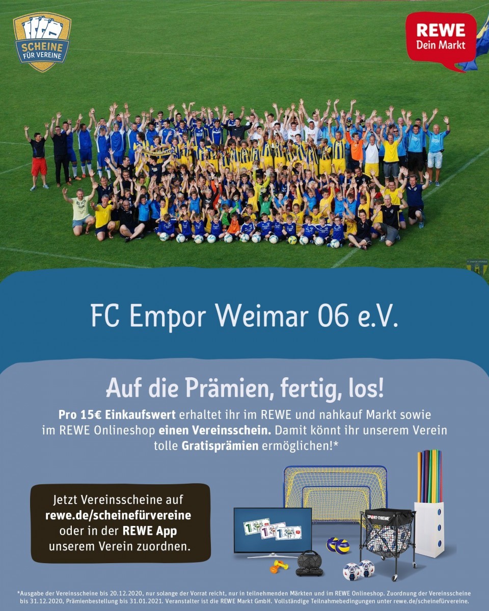 Pro 15 € Einkaufswert in einem Rewe Markt oder im Onlineshop erhaltet ihr einen Vereinsschein. Diesen Vereinsschein könnt Ihr dann unter dem angegebenen Link oder wenn ihr die REWE App nutzt – ganz bequem einscannen und eurem Herzensverein, dem FC Empor Weimar e.V., zuordnen.