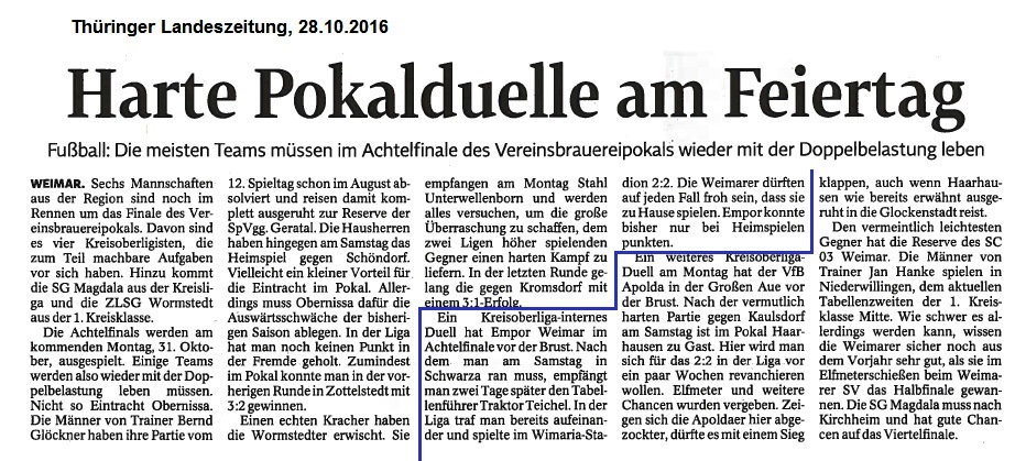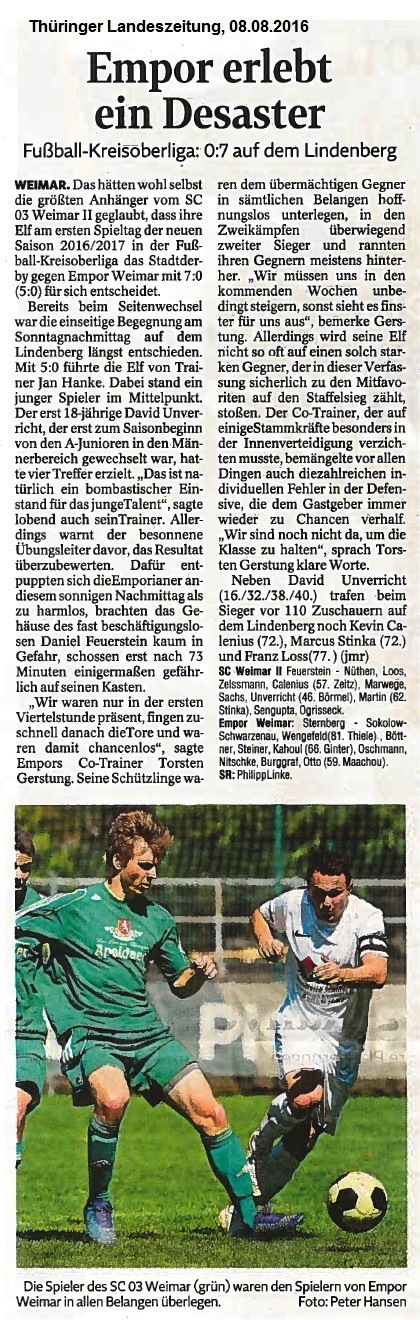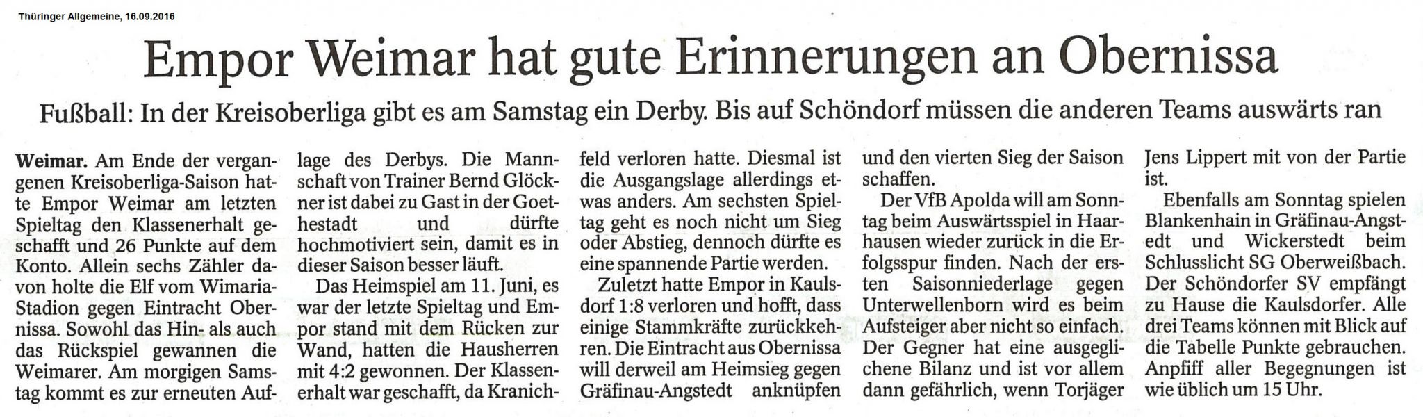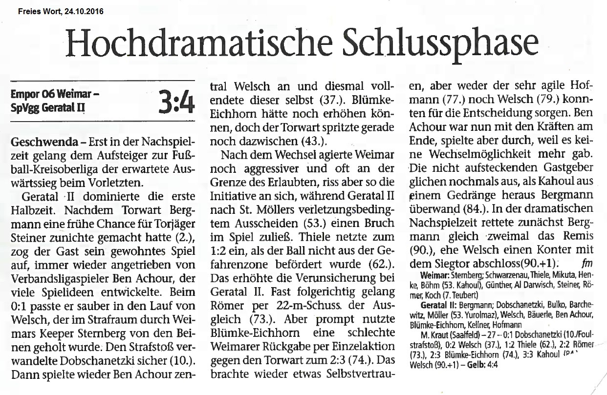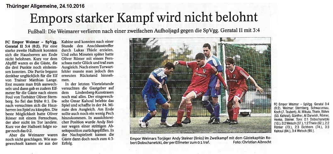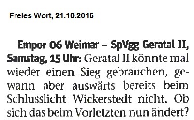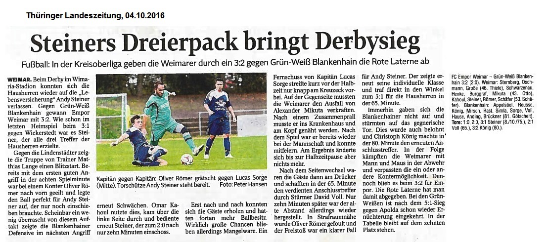 | 04.10.2016 | TLZ | 1. Männer | FSV GW Blankenhain | 3:2/H | Spielbericht |