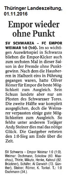 | 01.11.2016 | TLZ | 1. Männer | SV 1883 Schwarza | 1:0/A | Spielbericht |