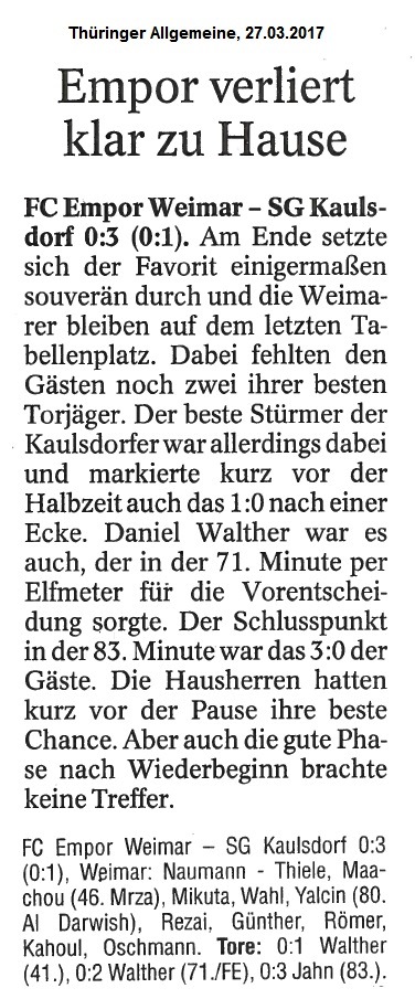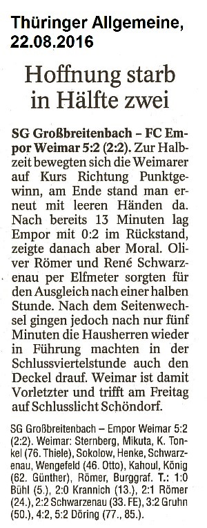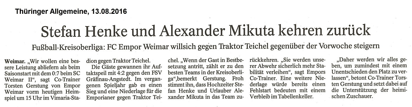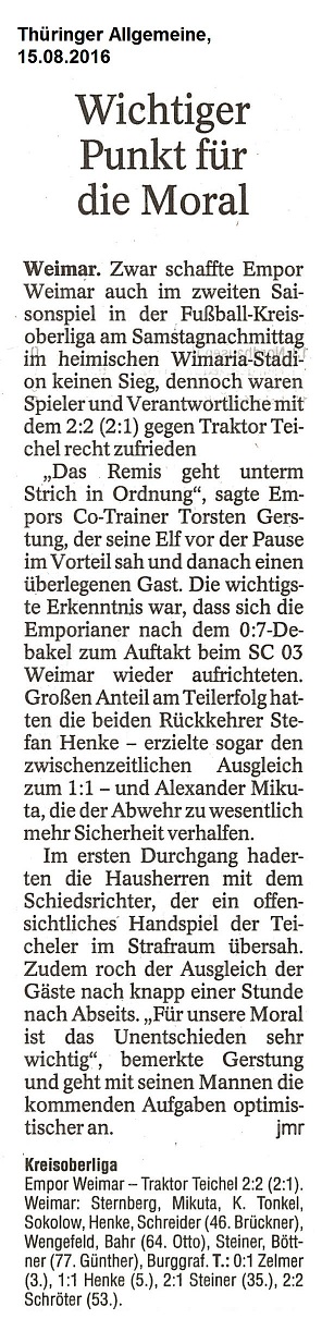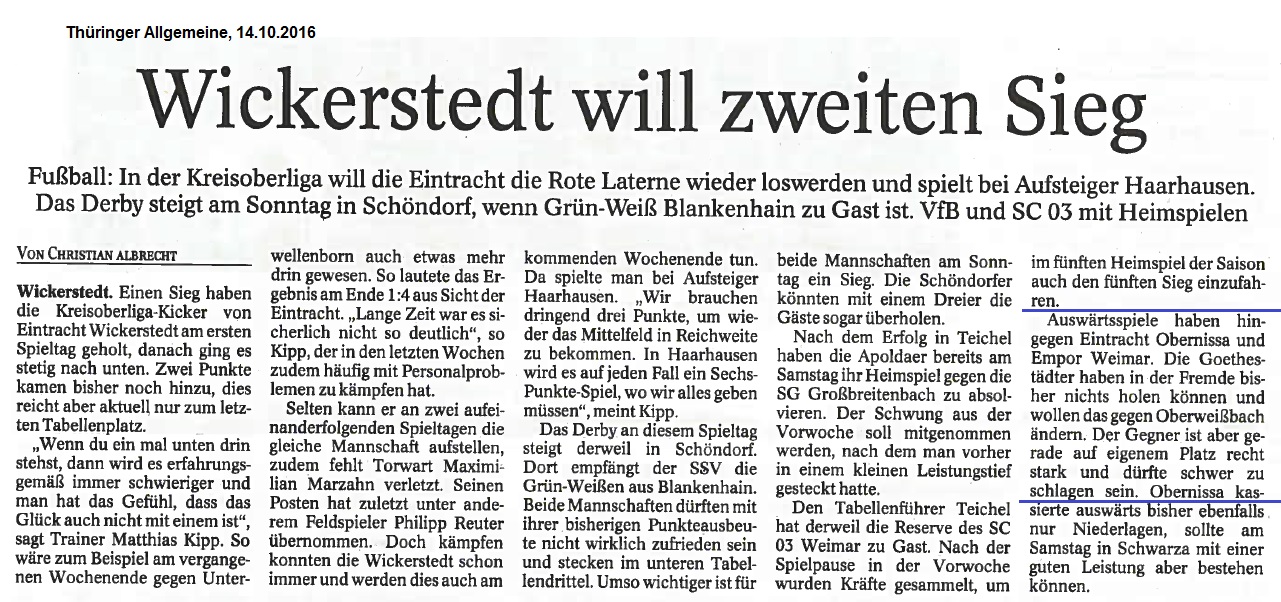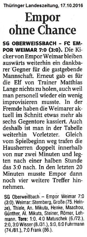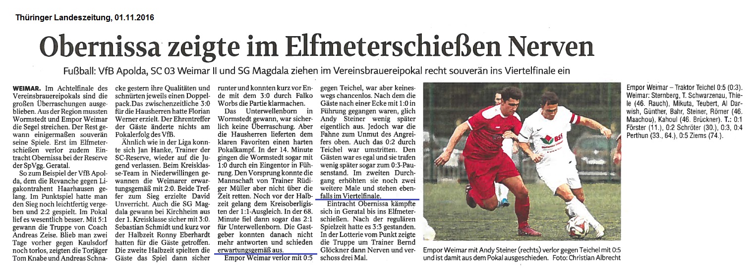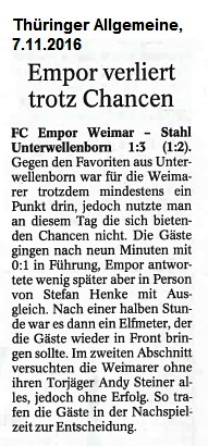 | 07.11.2016 | TA | 1. Männer | SV Stahl Unterwellenborn | 1:3/H | Spielbericht |