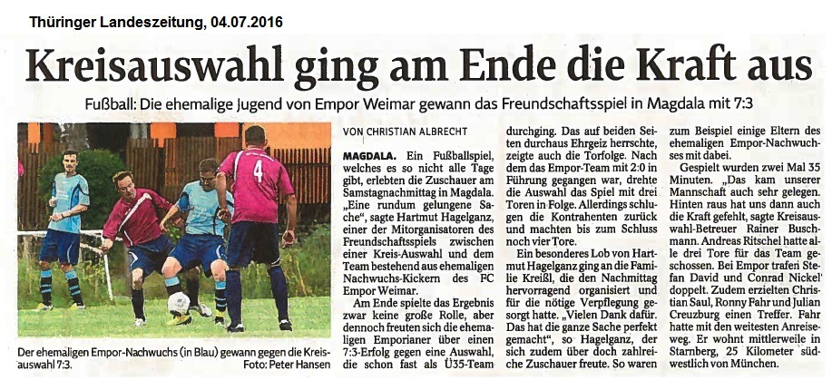 | 04.07.2016 | TLZ | Ehemaliger NW | Kreisauswahl | 7:3 | Bericht |