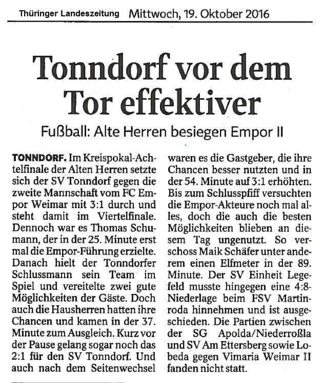 | 19.10.2016 | TLZ | 2. Alte Herren | SV 70 Tonndorf | 3:1/A | Spielbericht |