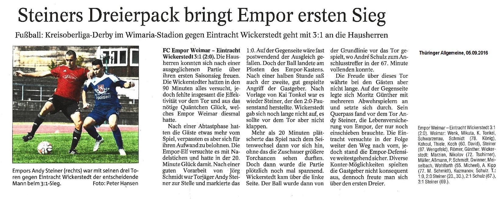 | 05.09.2016 | TA | 1. Männer | SV Eintracht Wickerstedt | 3:1/H | Spielbericht |