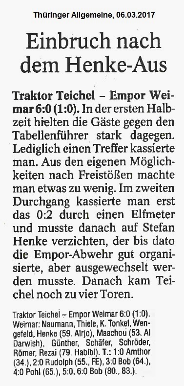 | 06.03.2017 | TA | 1. Männer | SG Traktor Teichel | 6:0/A | Spielbericht |