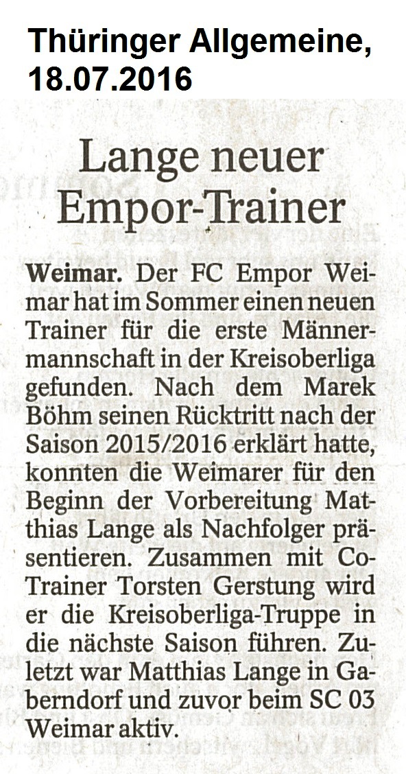 | 18.07.2016 | TA | 1. Männer | Neuer Trainer | Bericht | |