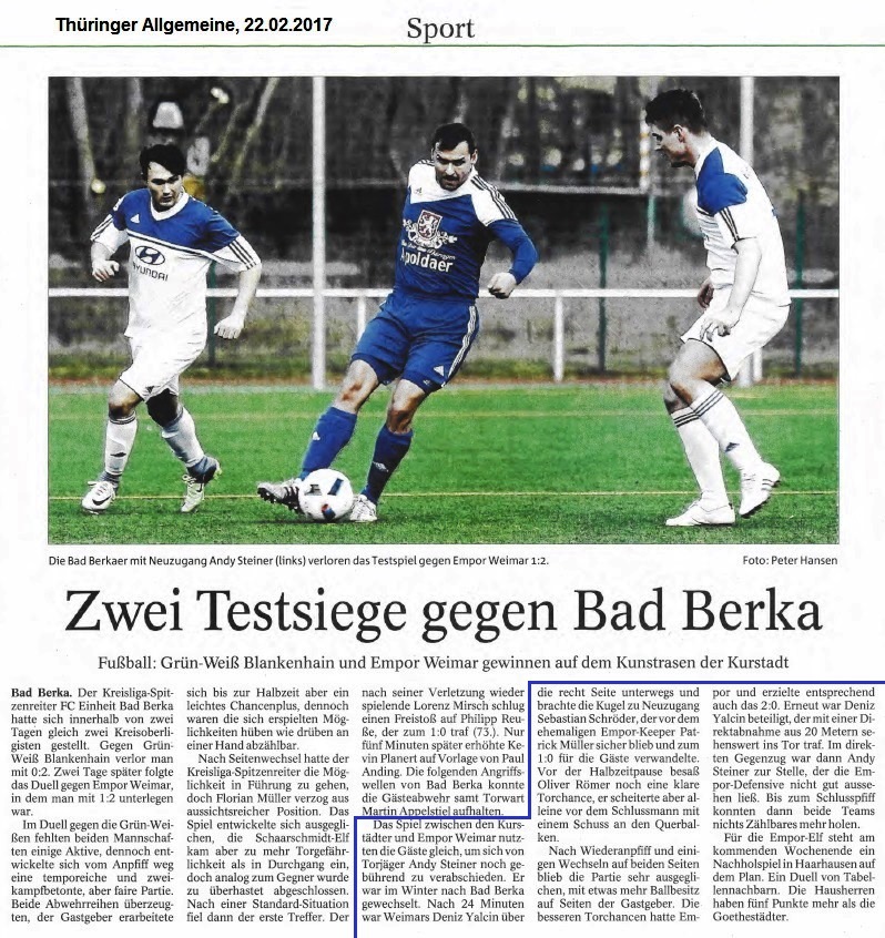 | 22.02.2017 | TA | 1. Männer | FC Einheit Bad Berka (FS) | 1:2/A | Spielbericht |