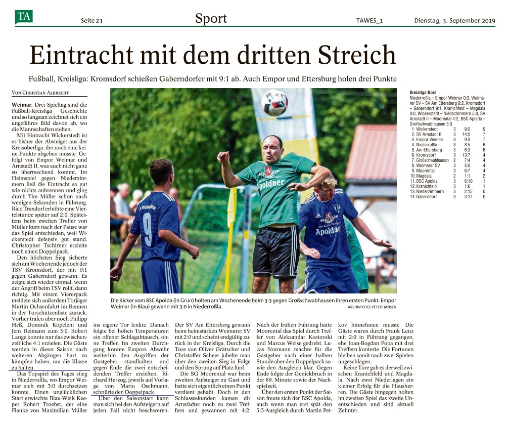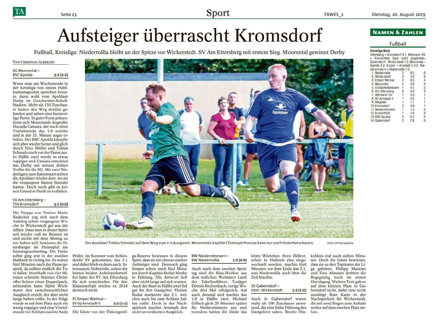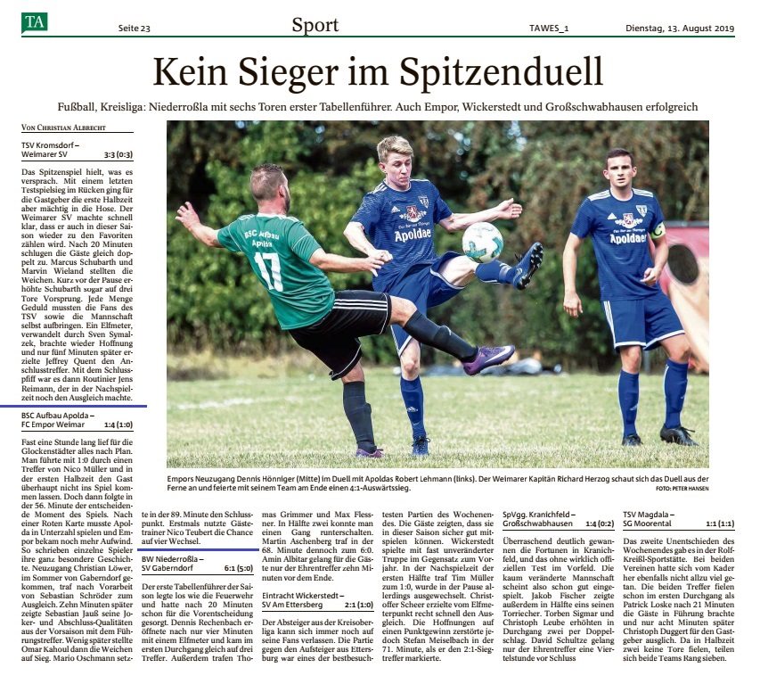 | 13.08.2019 | TA | 1. Männer | BSC Apolda | 1:4/A | Ligabericht |