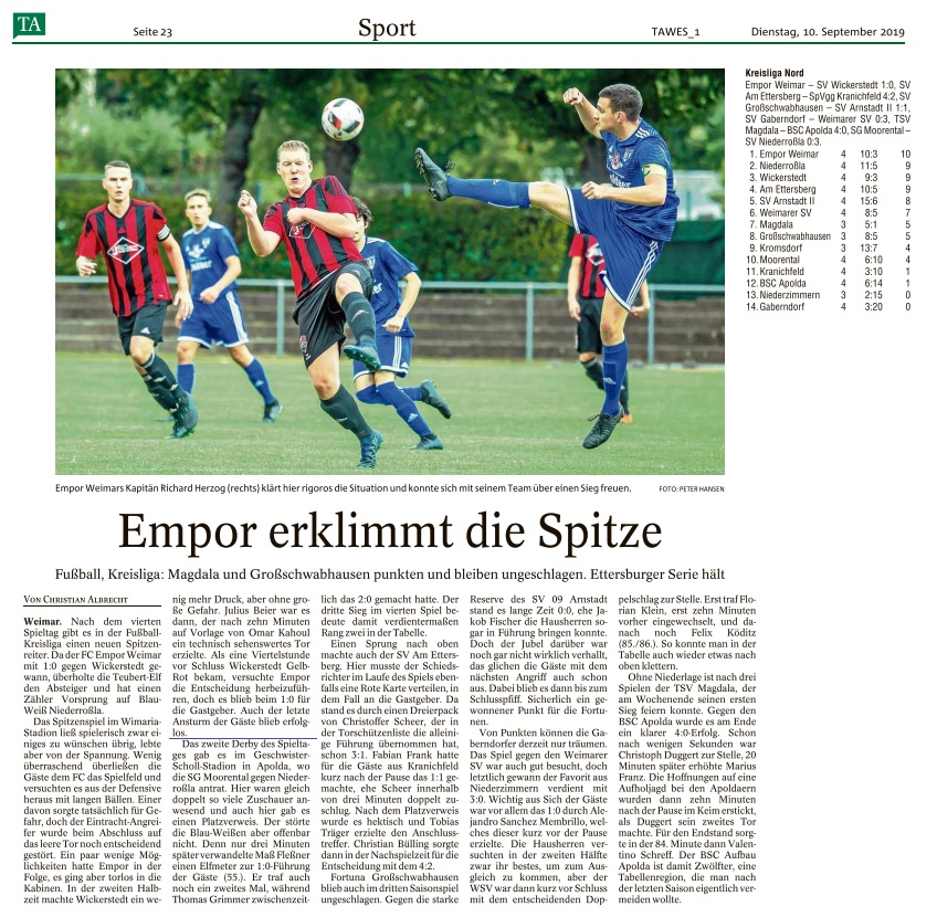 | 03.09.2019 | TA | 1. Männer | SV BW Niederroßla | 0:3/A | Ligabericht |