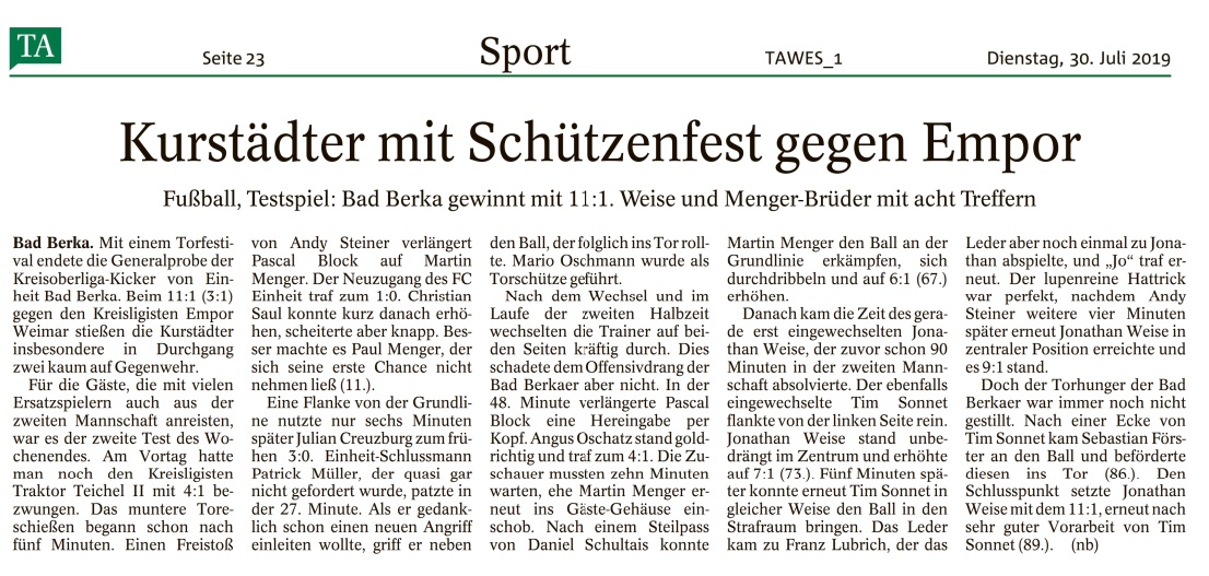 | 30.07.2019 | TA | 1. Männer | FC Einheit Bad Berka/Testspiel | 11:1/A | Spielbericht |